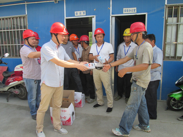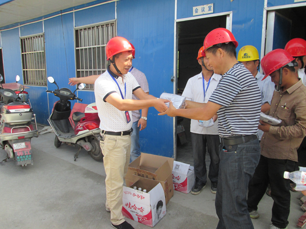 公司總經(jīng)理向福全農(nóng)民公寓項目部人員發(fā)放高溫慰問品